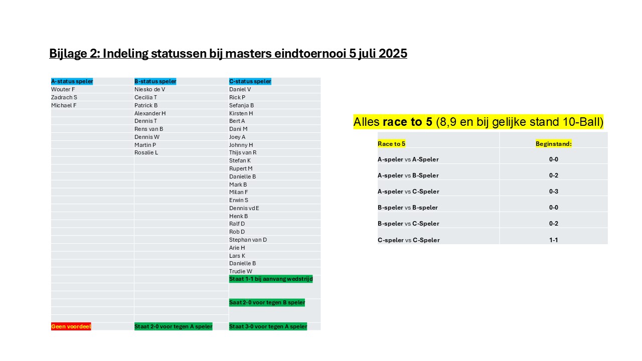 • Indeling statussen van de spelers zijn bepaald n.a.v. vorige gespeelde seizoenen (zie bijlage’s):