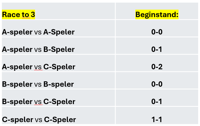 • A en B spelers spelen met een handicap (beginnen met een achterstand)